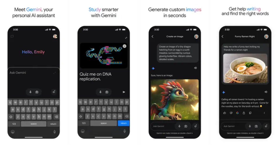 Μέσα από την εφαρμογή Gemini, οι χρήστες μπορούν να κάνουν ερωτήσεις, να ζητούν βοήθεια με δημιουργία κειμένων, να συνοψίζουν email, να προγραμματίζουν, να μεταφράζουν, ακόμα και να δημιουργούν εικόνες, χρησιμοποιώντας τις δυνατότητες του μοντέλου Gemini 1.5 Pro.