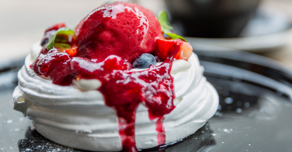 Ατομικές φωλιές τραγανής μαρέγκας, γεμισμένες με σαντιγί που θα σερβίρουμε με σορμπέ κόκκινων φρούτων και ψιλοκομμένα φρούτα εποχής περιχυμένα με φρουτένια σάλτσα.