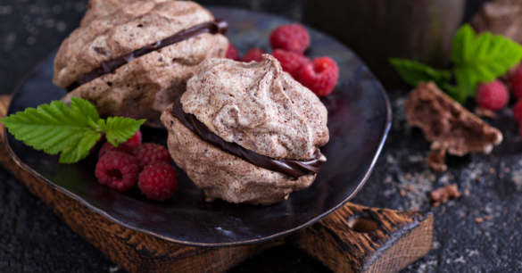 - Όταν κρυώσουν οι μαρέγκες και η κρέμα της σοκολάτας, παίρνουμε μία μία τις μαρέγκες και βάζουμε στην επίπεδη πλευρά τους λίγη κρέμα πριν κολλήσουμε πάνω τους μια δεύτερη μαρέγκα.