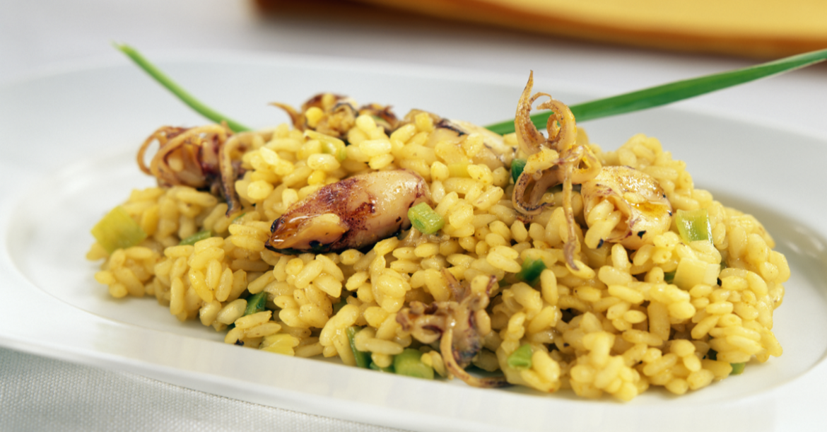 - Προσθέτουμε τα καλαμαράκια και σοτάρουμε για 4-5 λεπτά ακόμη. Ρίχνουμε και το ρύζι και το φέρνουμε μερικές βόλτες στο τηγάνι να γυαλίσει.