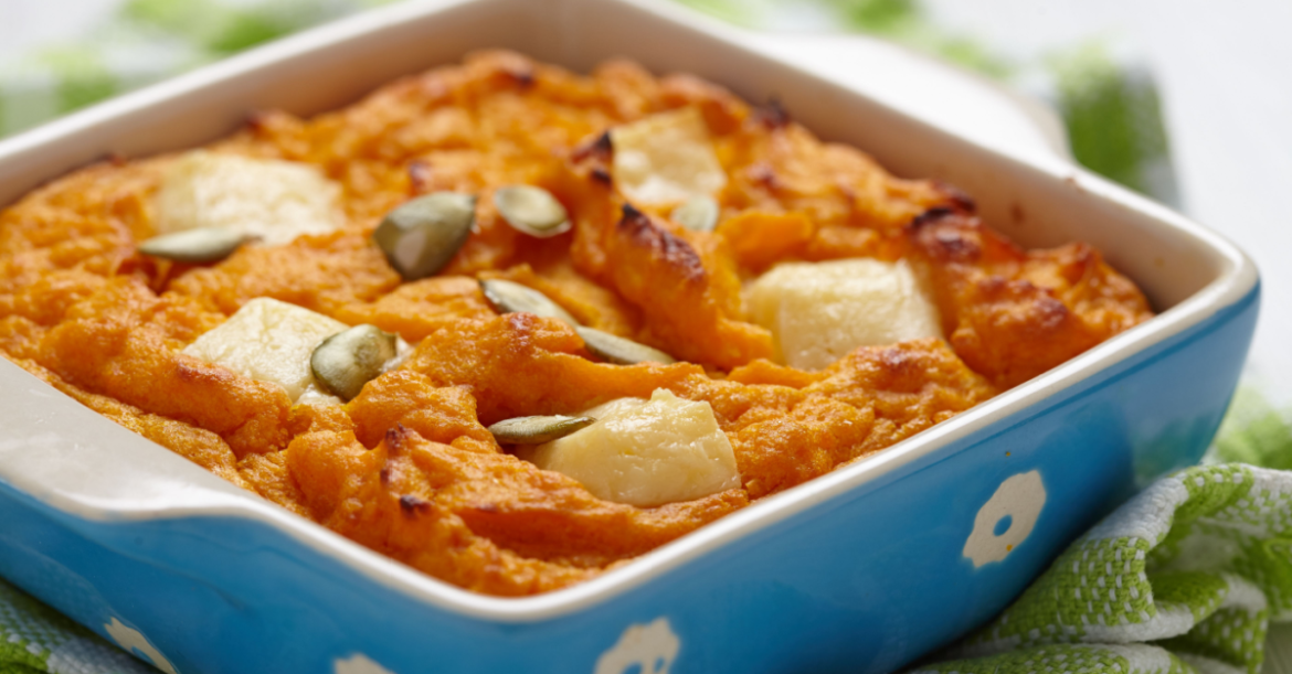 - Ενσωματώνουμε τη μαρέγκα στο μίγμα της κολοκύθας σε τρεις δόσεις κάνοντας απαλές κινήσεις με μια σπάτουλα και αδειάζουμε το μίγμα στο πυρίμαχο σκεύος που προετοιμάσαμε.