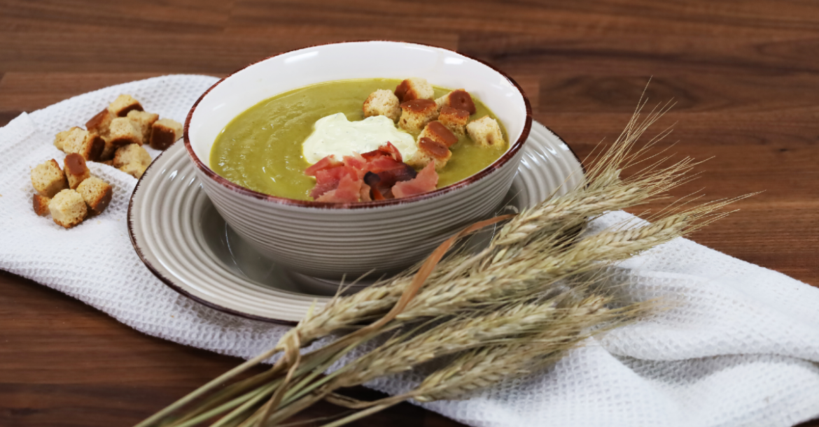 - Μοιράζουμε τη ζεστή σούπα σε ατομικά μπολ και προσθέτουμε το μπέικον και τα κρουτόν λίγο πριν σερβίρουμε.