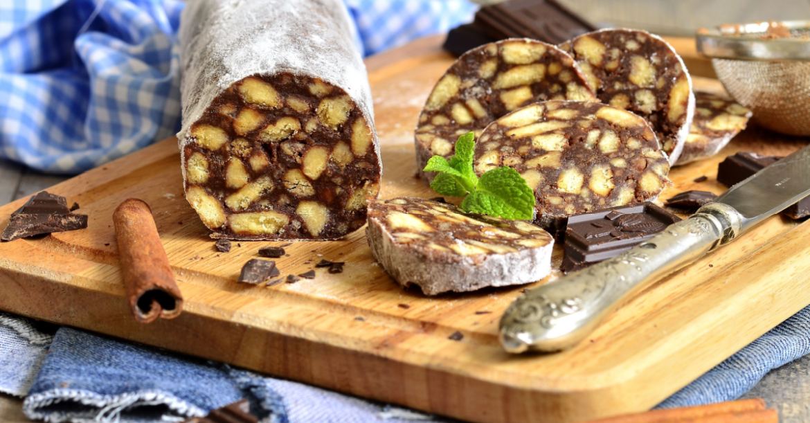 - Το βγάζουμε από το ψυγείο και με τη βοήθεια της λαδόκολλας, ρολάρουμε το μείγμα να πάρει σχήμα κυλίνδρου σαν σαλάμι.