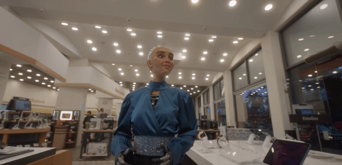 Πιο συγκεκριμένα, η Sophia πήρε το αεροπλάνο και ταξίδεψε ως τη Ρόδο. Από το αεροδρόμιο πήγε απευθείας στο κατάστημα του Κωτσόβολου, όπου φιλοξενήθηκαν τα γυρίσματα του νέου project του youth influencer-youtuber Hacky. Το πανέξυπνο ρομπότ έδειξε ένα μέρος από το μεγάλο ταλέντο του “επί σκηνής” τραγουδώντας για πρώτη φορά με τον καλλιτέχνη της hip-hop σκηνής Lil Koni, παρουσιάζοντας όλο λάμψη και ζωντάνια το τραγούδι “A.I. Love – Lil Koni ft Sophia”.