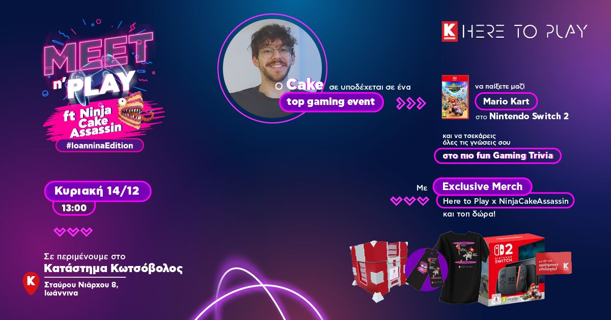 Το Here to Play συνεχίζει το ταξίδι του και αυτή τη φορά σε φέρνει… αντιμέτωπο με τον ίδιο τον NinjaCakeAssassin! Αν αγαπάς το Mario Kart, τότε αυτό το event είναι η πίστα που δεν πρέπει να χάσεις. Θα παίξεις στο ολοκαίνουργιο Nintendo Switch 2, θα μπεις στο πιο απολαυστικό gaming trivia με τον Cake και, αν είσαι αρκετά τυχερός, μπορεί να φύγεις με το απόλυτο δώρο: ένα Nintendo Switch 2 μαζί με το Mario Kart World!